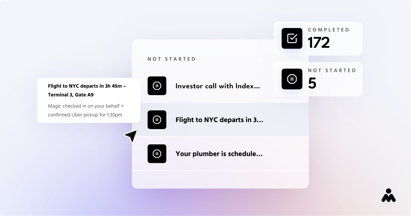 We track tasks and keep priorities aligned with your goals, clear blockers so work keeps moving, and fill in during transitions if you’re between assistants. For tasks with clear outcomes, Magic checks progress and verifies the work was done right. We also conduct periodic quality checks through screenshot reviews and human review of completed work. These are optional and can be turned off if you prefer to handle oversight yourself.