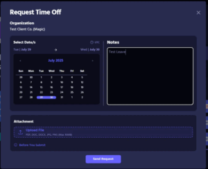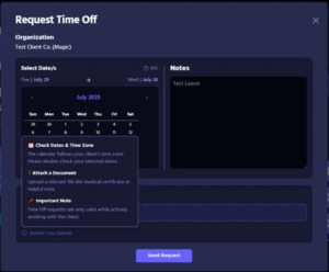 The “Leaves Tracker” feature allows assistants to request time off directly within their Workspace dashboard. Once filed, the leave request is automatically routed to your client and Account Lead for visibility and approval.