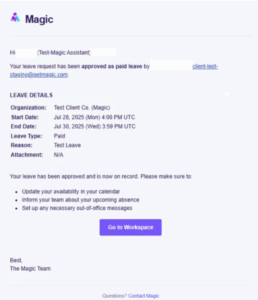 Workspace filing is the default process for all assistants. If you and your client already have a clear and consistent system for filing leaves (e.g. via email, calendar, or a shared tool), and it works well for both sides, inform your Account Lead so we can disable this feature for your account to avoid confusion.